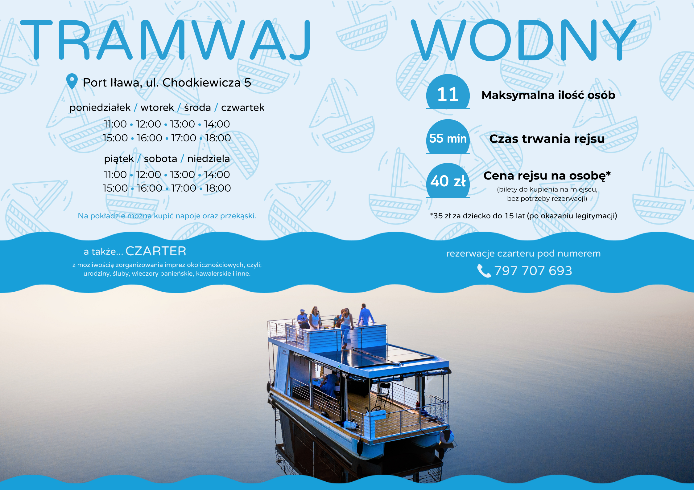 Zapraszamy do Portu Iława na ul. Chodkiewicza 5 na cogodzinne rejsy! Tramwaj odpływa o każdej pełnej godzinie od 11:00 do 18:00.